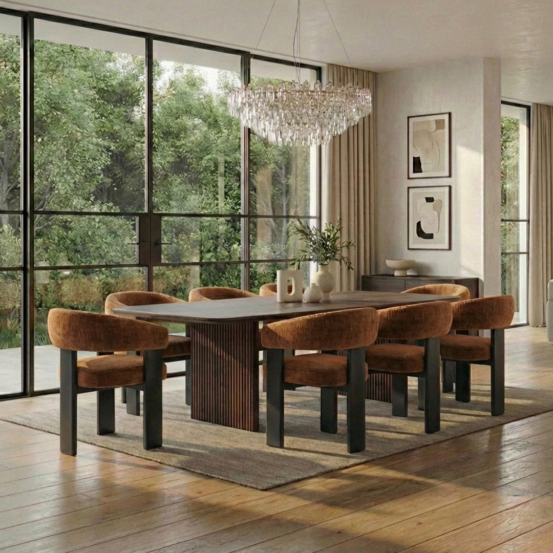 Transform your dining space with the Sculpted Metal Leg Armchair, a masterpiece of modern luxury and ergonomic comfort. This standout piece features sumptuous tan velvet upholstery with a rich, textured finish that catches the light beautifully, paired with generously padded, curved barrel arms that envelop you in plush support. The low, wide seat offers exceptional comfort for long meals or relaxed gatherings, while the chunky black metal legs provide sturdy stability and a bold industrial edge that contrasts perfectly with the soft upholstery.